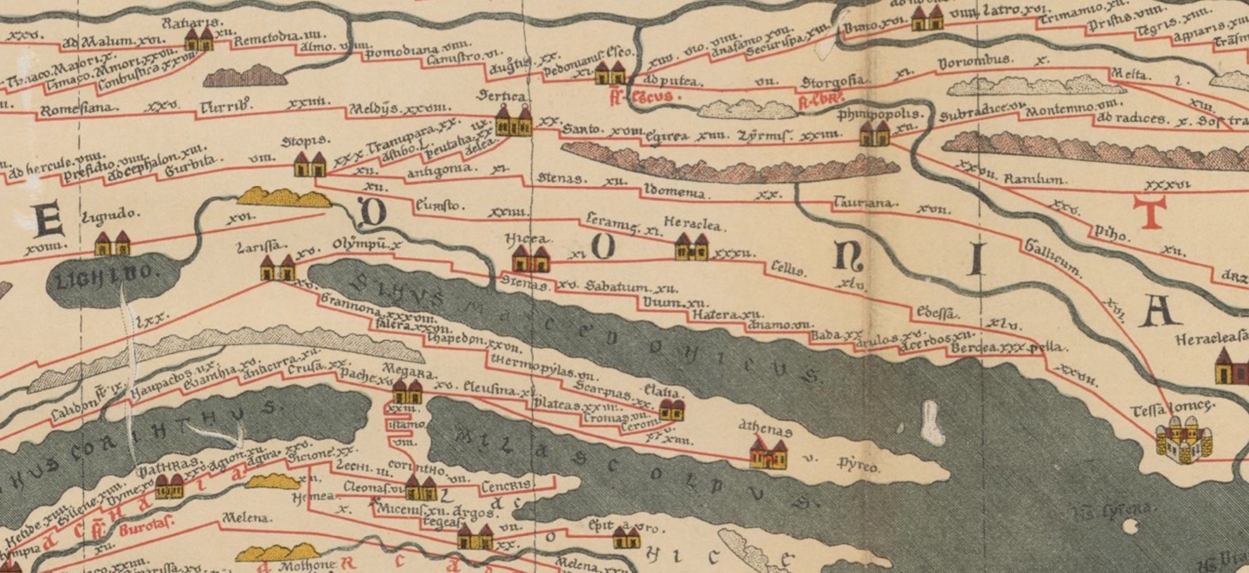 The part of the Peutinger table showing the road from Ohrid (the lake on the left of the picture) to Thessaloniki (on the far right)