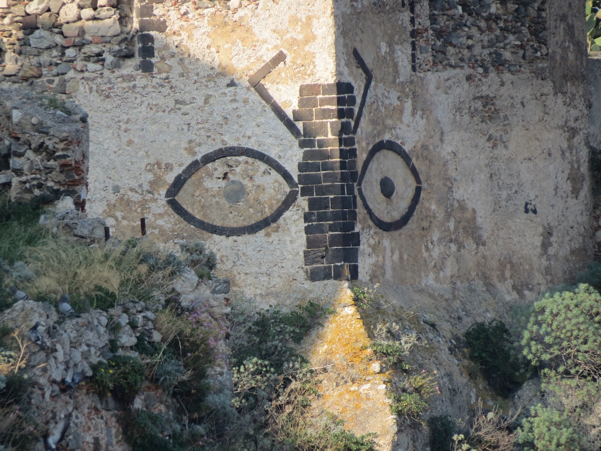There is one other curiosity which the visitor should not miss. Ideally, one should walk round the outside of the castle to the North side, for the best view – but there in the wall, you will see the curious design of an “insect” built into the rocks. No one really has an explanation of how this came to be here or indeed, what it stands for, but it is known as the “Scarabeo” of Milazzo.