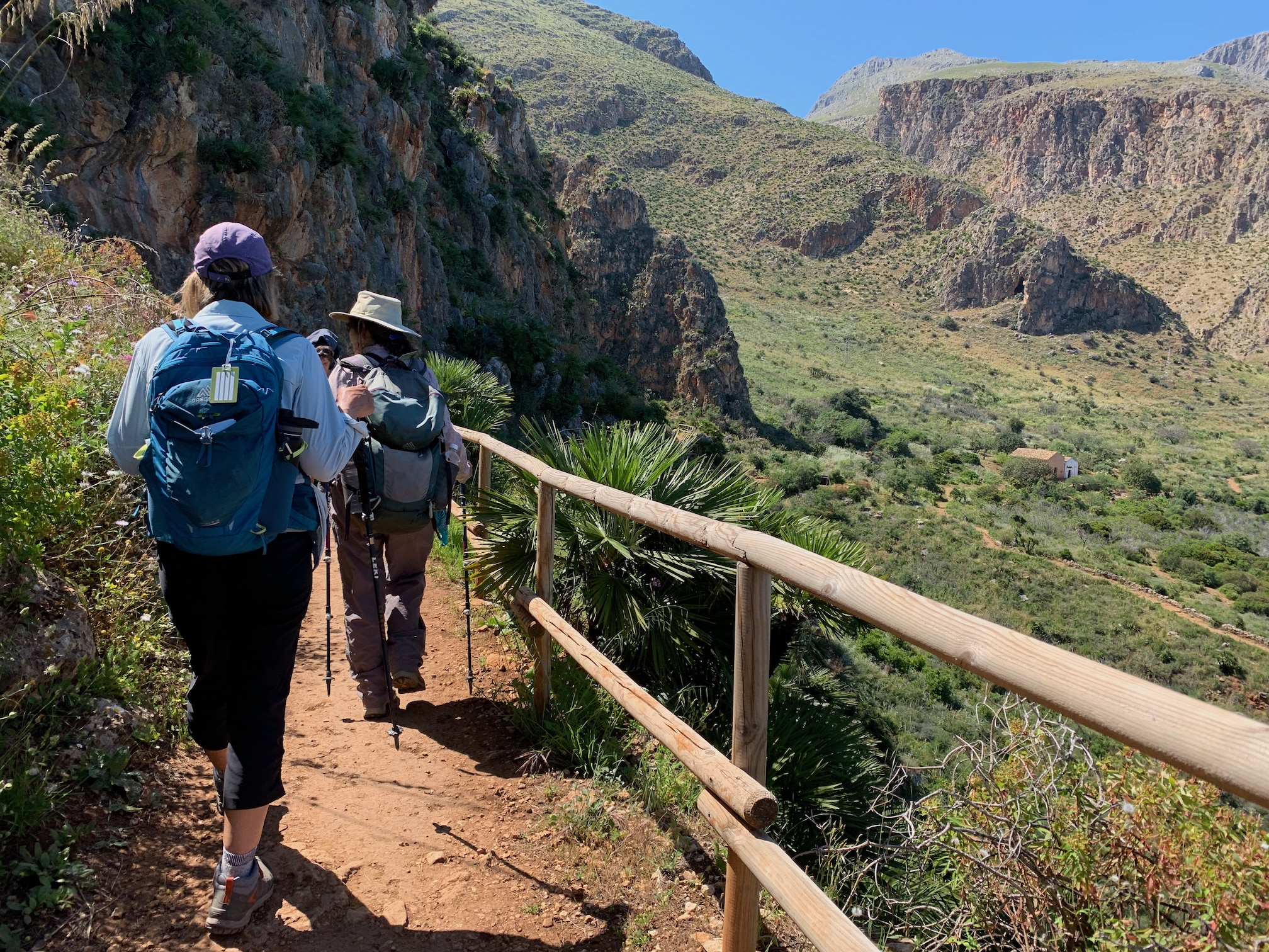 We begin our walk just a couple of kilometres from the sleepy fishing village of Scopello, at the entrance to Parco dell Zingaro. Our walk follows the shore through the typical Mediterranean macchia and we are blessed with views over the azure sea towards Palermo.