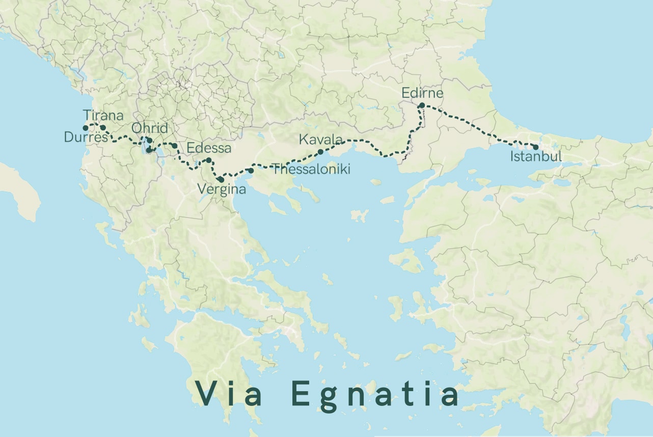 The Via Egnatia was the continuation of the Via Appia on the Eastern side of the Adriatic, passing through Ancient Illyria, Macedonia and Thracia to Constantinople. With a total distance of 696 miles, it was constructed by the Romans in the second century BC as a route through harsh territory inhabited by unruly peoples to reach the Eastern Mediterranean and circumvent a journey that otherwise took several weeks by sea.